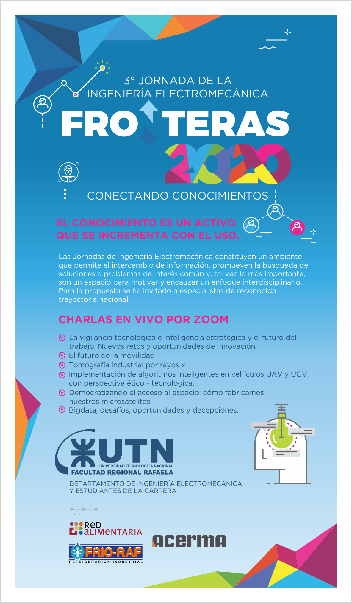El próximo jueves 13 de agosto se llevará a cabo la 3º Jornada de la Ingeniería Electromecánica “Fronteras 2020. Conectando conocimientos”. A diferencia de años anteriores, en esta oportunidad el evento tendrá modalidad virtual, y se realizará a través de la plataforma ZOOM.